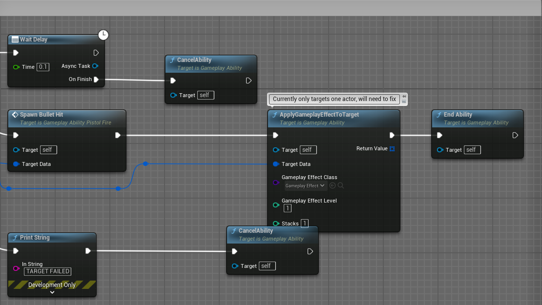 With just GAS, this normally wouldn’t work. The default targeting system requires a player controller so that it can use player’s control rotation. Wait Trace Target Data From Actor is a custom task developed for ability items that instead uses the actor eyes view transform to fire a trace. This allows item abilities to be used by anything from players to AI to the items themselves.